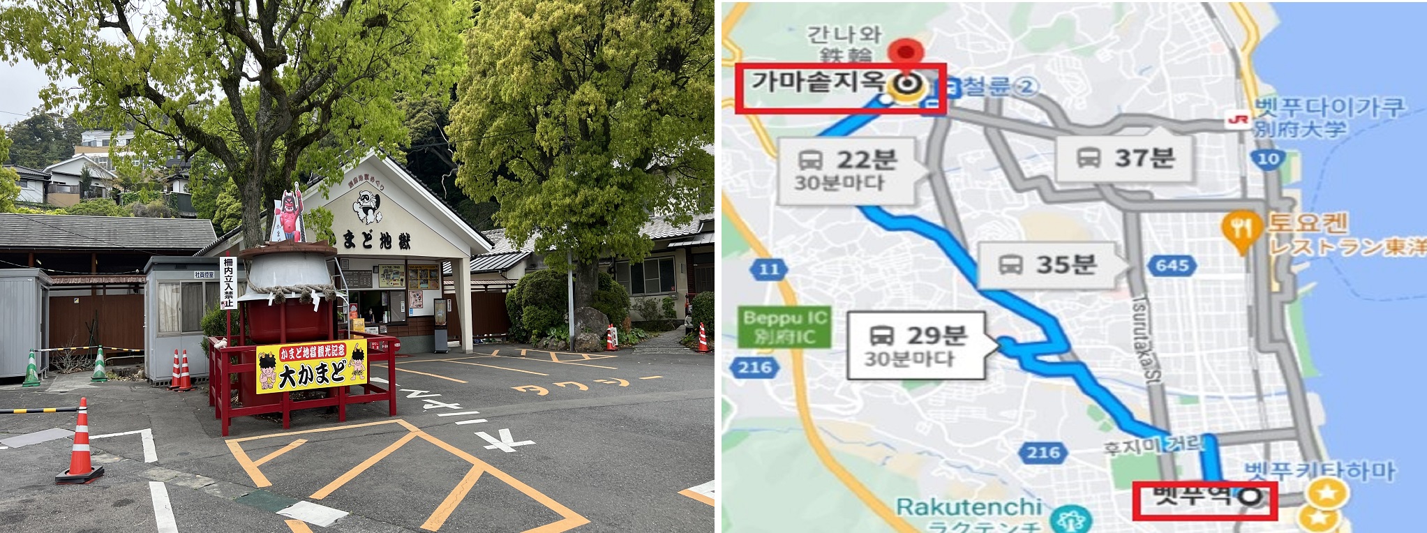 16, 16a, 20번 버스는 벳푸 에키마에 > 간나와 (23개 정류장 31분) > 도보 350미터