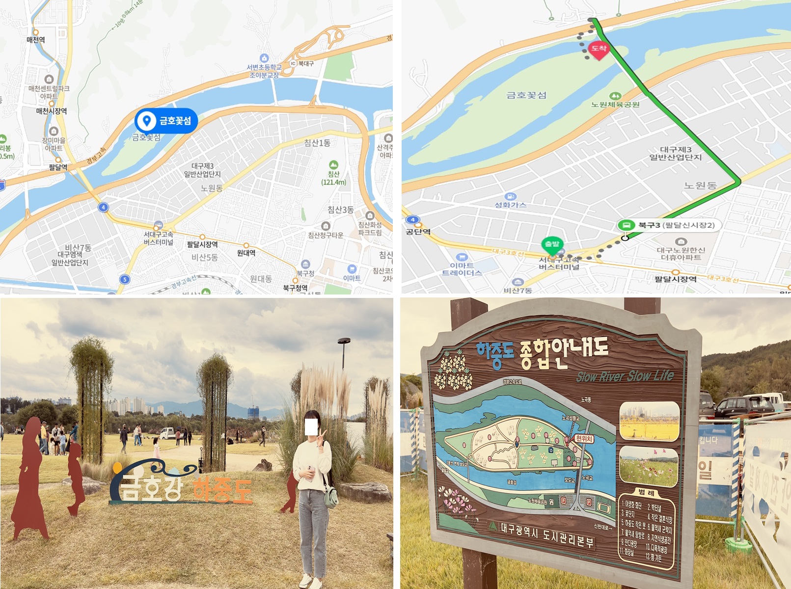 개인차량으로 방문하실 분들은 노원체육공원 (대구 북구 노곡동 876)을 찍고 오시면 되는데, 금호꽃섬은 작은 섬이라 차량 진입은 안되고 노곡교를 걸어서 갈 수 있습니다. 그래서 노원체육공원의 주차장에 주차를 하시면 되는데 주차비는 따로 받지 않는 무료입니다.