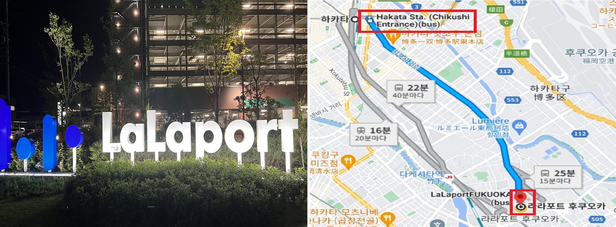 L번 버스는 Hakata Sta > LaLaport FUKUOKA(11개 정류장 17분) 역 하차 > 도보 200 미터입니다.
