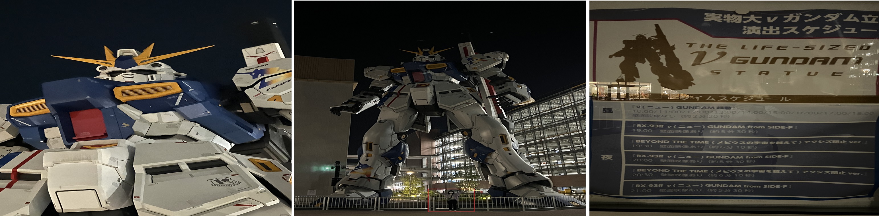 위 사진처럼 일반 사람이 발 바로 밑에서 찍었을 때 차이가 엄청나게 나는 것을 확인 가능합니다. 그리고 공연을 하는데, A.M. 10:00 ~ P.M. 19:00까지는 한 시간에 한 번씩 공연을 하고, 그 이후로는 21시까지 30분에 한 번씩 공연을 합니다만, 낮시간과 저녁 시간 그리고 저녁 시간에는 격회로 다른 공연을 보이기 때문에 한 번만 보셔도 좋고 저녁시간에 넉넉잡아 한 시간가량 두 개의 테마를 보셔도 좋을 것 같습니다. 약간의 움직임과 영상 노래등이 나와서 어릴 적 로봇을 타고 악당들과 싸우는 상상에 빠질 정도로 뭔가 매력이 있는데, 저녁 공연이 더 화려하니 가능하시면 저녁에 보시길 추천드립니다.