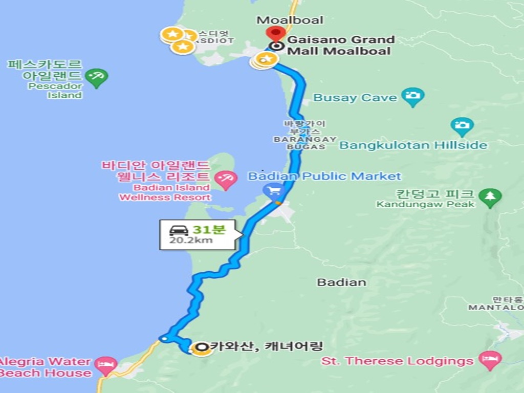 두 번째로 알려드릴 정보는 찾아오시는 길입니다. 위에서도 여러 번 말씀드렸지만, 카와산 캐녀닝은 한국에서 미리 결제보다는 현장 결제가 제일 저렴합니다. 세부 전역에서 가이드와 픽업 등등을 하시겠다는 분들이 많이 있습니다. 그렇기에 그런 분들에게 하셔도 되지만, 카오산의 경우는 전문 가이드가 필요로 하기 때문에 라이선스가 있어야 가이드가 가능하시니 의심이 되신다면 라이선스를 보여달라고 하셔도 됩니다.