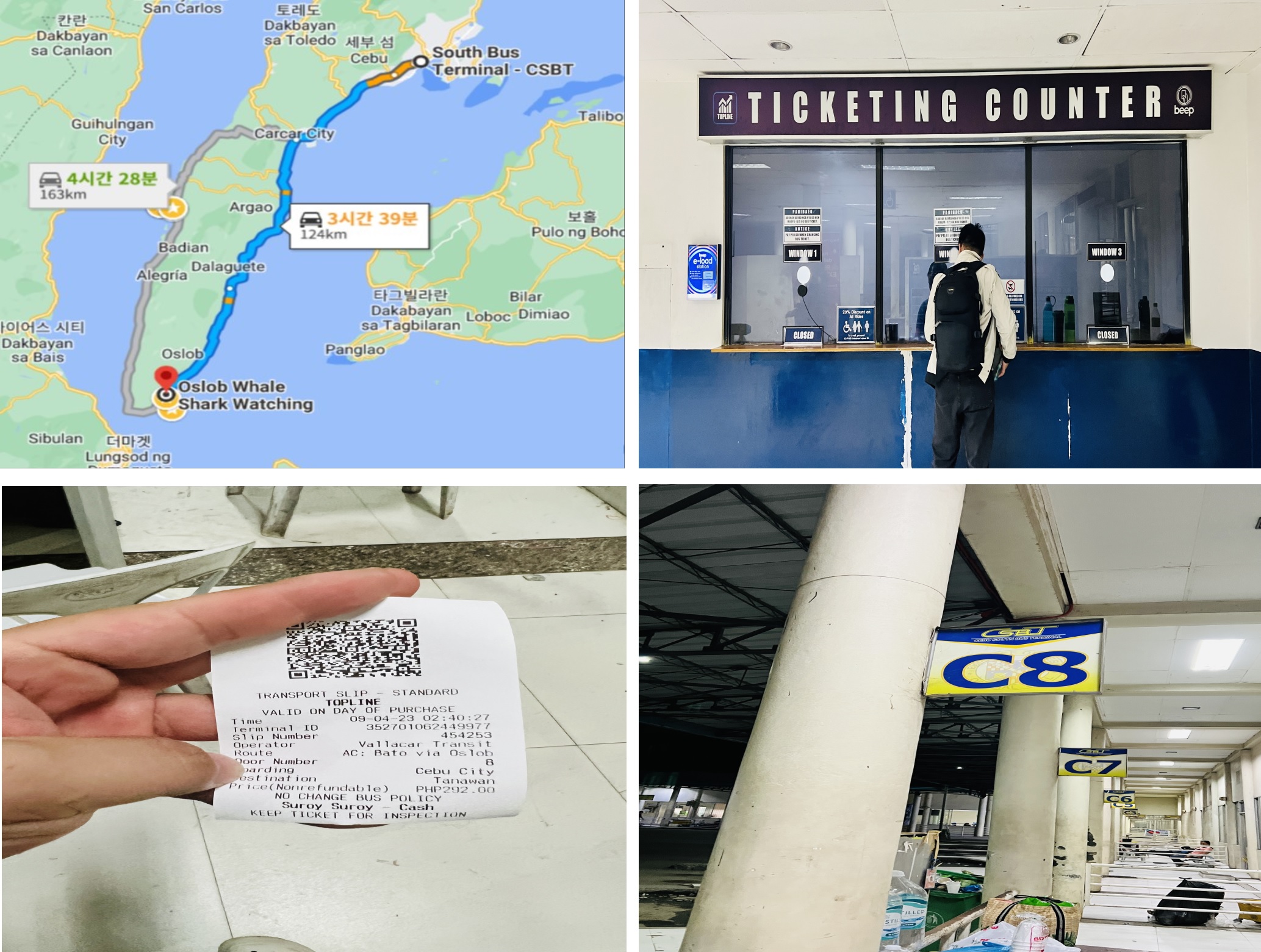 오슬롭을 가는 방법을 막탄에서부터 설명을 드리자면 막탄에 위치한 South Bus Terminal 로가서 하행선 버스를 타야 하는데요. 저희는 막탄 공항에서 새벽 2:30분쯤 흰색 택시를 타고 남부 버스 터미널에 400페소(9,500원)에 갔습니다.