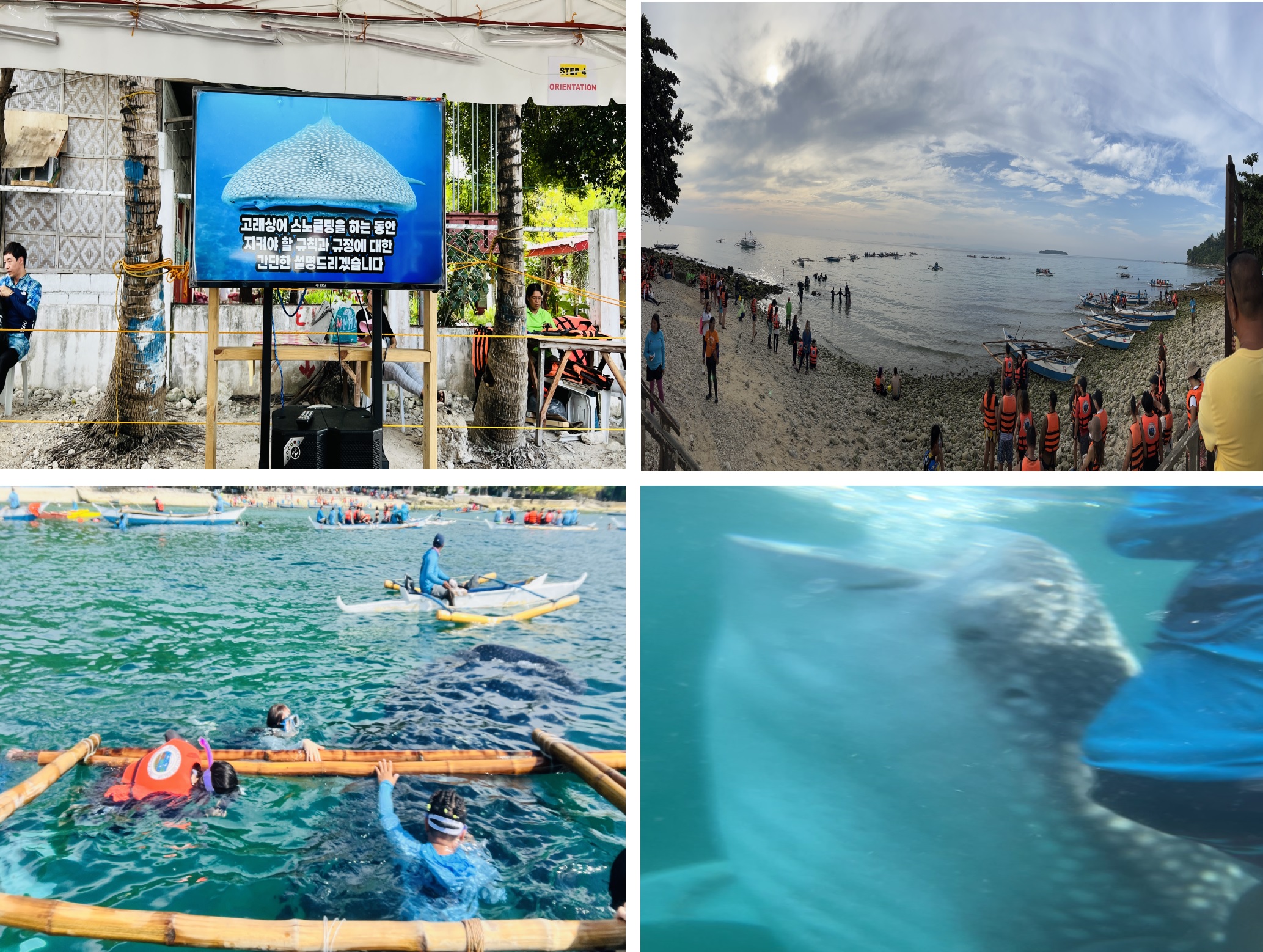 필리핀도 처음이고 고래상어도 처음 봤는데, 정말 잊지 못할 추억이었습니다. 한 가지 아쉬운 것은 만약 일정을 여기를 2일 차 혹은 수밀론에서 하루 수영 연습을 하고 왔었더라면 고래 상어를 좀 더 자세히 볼 수 있었을것 같아서 아쉬움이 많이 남았습니다. 왜냐하면 스노클링 장비 사용이 서툴러서 시작부터 엄청 짠 바닷물을 먹고 나니 바다 멀미를 심하게 했습니다. 게다가 같은 배에 탄 어떤 여성분은 바다에 오바이트를 하기도 해서 고래 상어를 보는데 조금 힘든 점이 있었습니다.